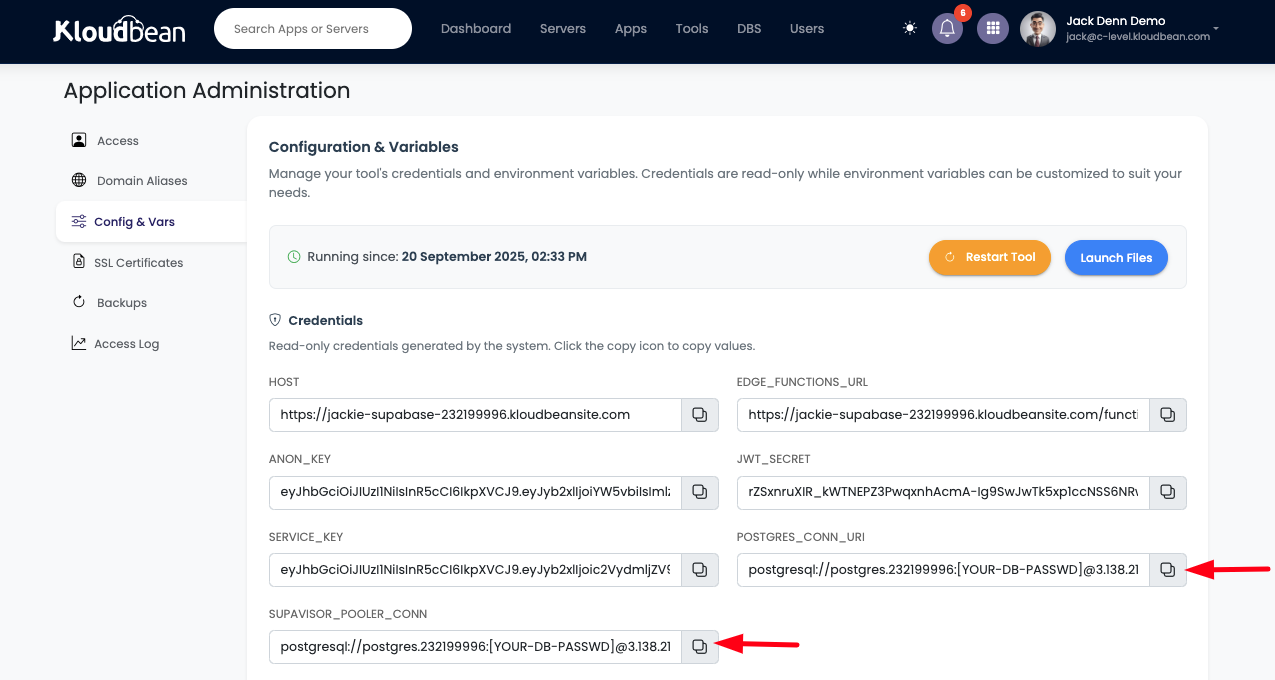 Kloudbean provides two important API keys for accessing and interacting with your Supabase instance: the Service Role Key and the Anon Key. These keys are used for different purposes and provide various levels of access to your Supabase services.